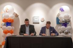 Dr. Michael Simon, Angelina College president, pictured left, and Dr. Neal Weaver, Stephen F. Austin State University president, sign a partnership agreement launching Jacks Jumpstart Feb. 3. The alternative admissions program helps first-semester freshmen at AC who narrowly miss meeting SFA admissions requirements when they initially apply by creating an affordable pathway to transfer to the university within one academic year.